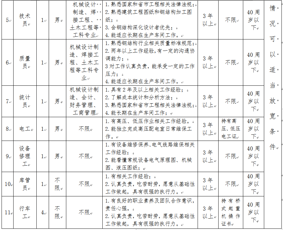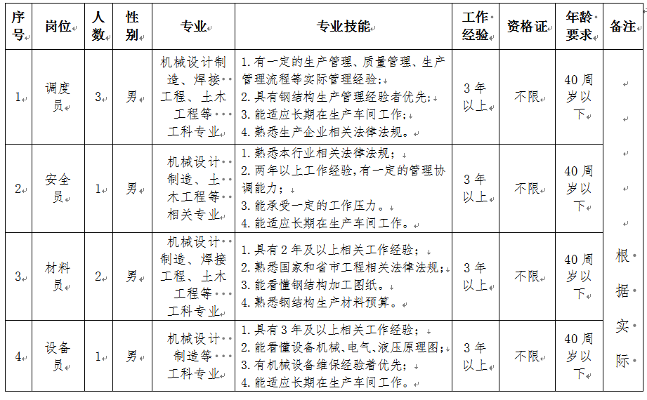 選聘人員包括調(diào)度員3名,安全員1名,材料員2名,設(shè)備員1名,技術(shù)員1名,質(zhì)量員1名,統(tǒng)計(jì)員1名,電工1名,設(shè)備修理工1名,庫(kù)管1名,行車工4名。具體要求如下: