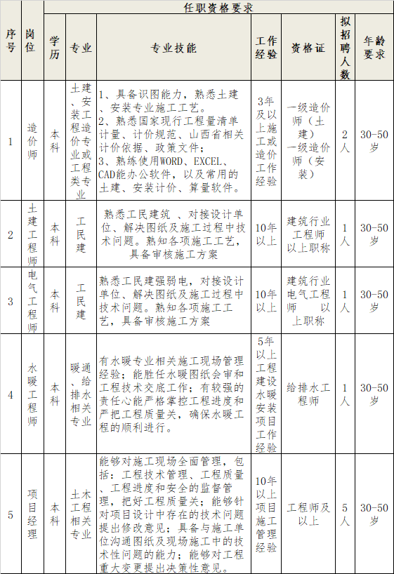 公開招聘專業(yè)技能人才,其中工程項(xiàng)目經(jīng)理5人,土建工程師1人,造價(jià)師2人,水暖工程師1人,電氣工程師1人。